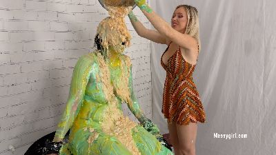 Mystique returns for more sexy and silly messy playtime. She is pied and slimed while wearing a fishnet stocking. She shows it all as she goes full nude.