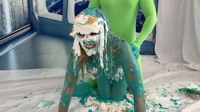 Astronaut Zoey is greeted in a very usually manner from a friendly alien