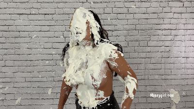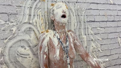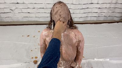 Zoey is nude and chained to a headboard and pied hard in the face. She keeps getting pied and soon a pie slop mound develops on her face. She is then set free so she can smear the pie mess all over her hot body.