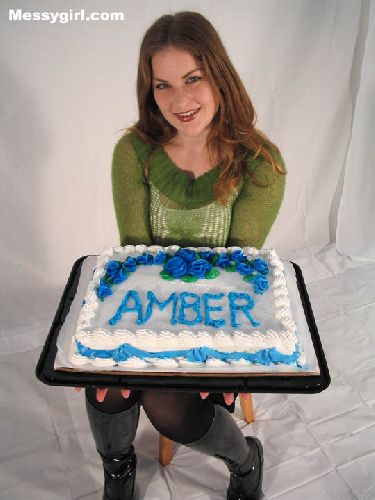 It’s Amber in her very first solo shoot. She starts out wearing a sweater top, skirt, stockings, panties and PVC boots. Amber shows just how much she loves to get messy with a pie onslaught, head dunking, slime pours and going face first in a large sheet cake! She makes sure she is covered head to toe as she slowly strips nude for her bare butt pieing!