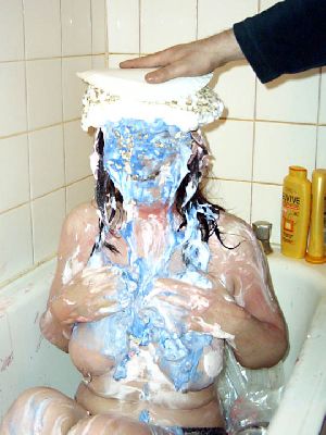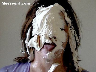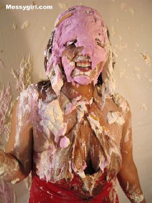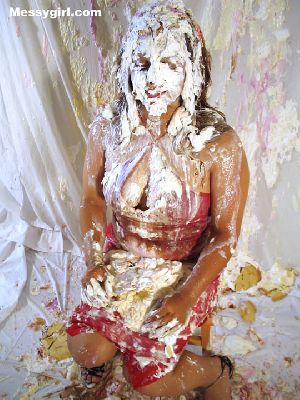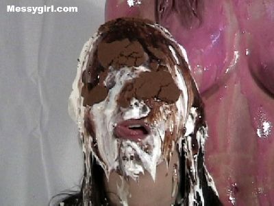 Messygirl starts out in her silk robe, black panties and bra. She is hit with cream pies and chocolate syrup poured over her pretty face.