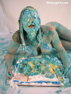 Liz is in her white lace tube top, thong panties, stockings and clear boots. She first fills her boots with melted ice cream before she is covered in pies and slime. She even sits on a sheet cake in the nude!