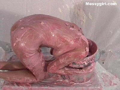 Katie is in only her thong, apron and chefs hat when she whips up her messy recipe of pies, chocolate cake and batter. First she is splattered with the pies and then coated in pink and blue batter. She then eats a chocolate cake with and without her hands, messygirl style! She makes sure to get it all over her face! Katie is a sloppy mess by the time she is done!