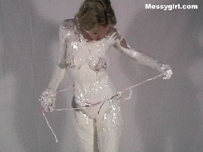 Liz is in her thong bikini as she covers herself in sticky marshmallow cream. She goes nude to cover all the other clean areas before a gallon of chocolate syrup poured on her. A very erotic transformation!