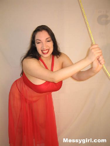 Raven is in her long sexy red teddy as she pulls the rope for her sliming. Then she pies her face and 38E breasts and goes head dunking in pudding! She also takes off her panties and pies herself between the legs!