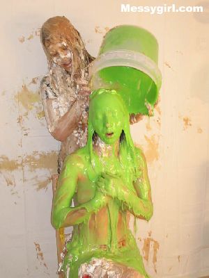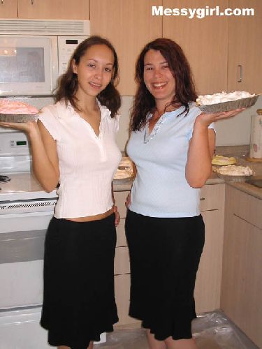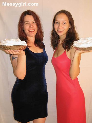 Lexi and Sara are together for the first time in a tit for tat pie and slime exchange. Both girls end up topless and covered head to toe!
