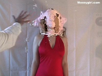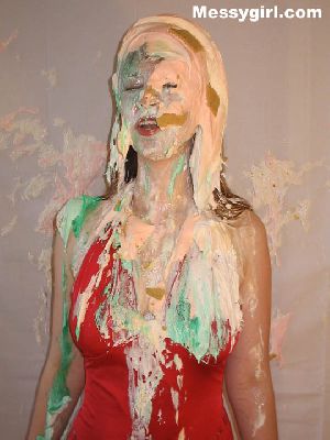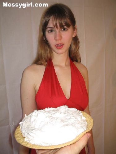 Sara gets the full messygirl treatment! She starts off wearing a sexy red halter dress and is covered in pies, slime and does some nude pie sitting!