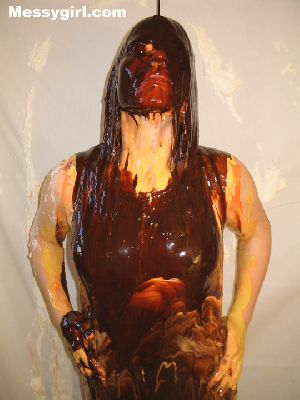 Raven enjoys her first messy session in and out of her body stocking. She is covered in pies, batter and chocolate syrup!