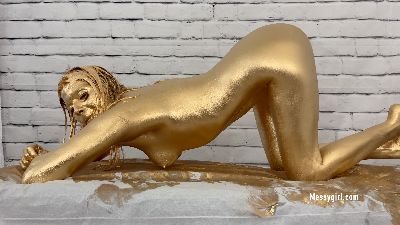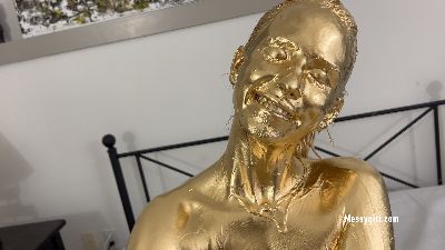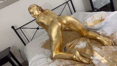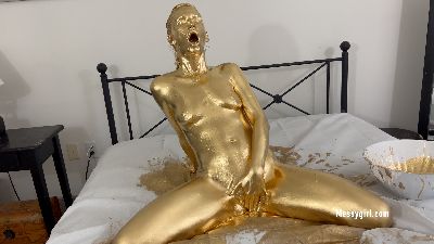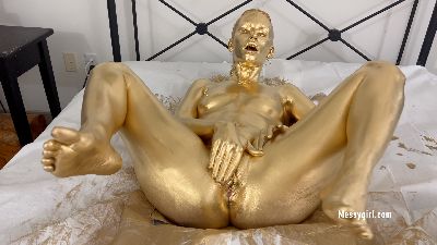 Sexy MILF Sofia is covered in gold paint and then masturbates until she cums. Vert hot stuff from this young mom.