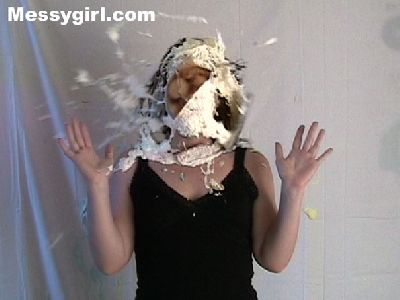 Sara puts on her tiny pink thong bikini for some pie and slime play.