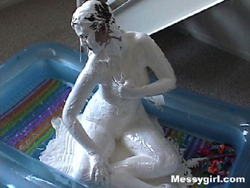 Sara covers herself head to toe in marshmallow cream.