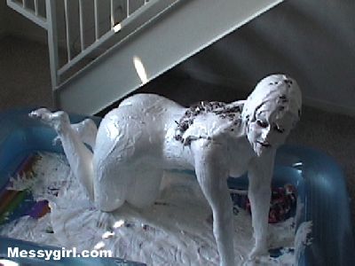 Sara covers herself head to toe in marshmallow cream and then tops it off with rice crispies. What a treat! She then washes off in two gallons of milk.