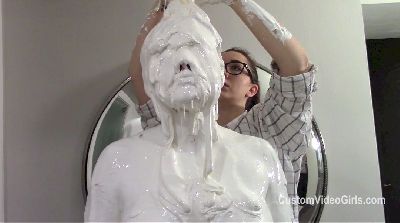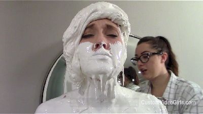 Amy is still being a bitch to her maid Misty and is still threatening to get her fired if she doesn't do a good job. Amy is getting ready for a big dinner party and is going to take a shower. She tells Misty she better have the place clean by the time she gets out of the shower. When Misty is cleaning, she gets a phone call. It turns out she got a new job. Misty is grateful, but has unfinished business with Amy to settle. So Misty pulls Amy out of the shower and is about to give her a taste of her own medicine. Misty ties up Amy's arms and legs so that she is standing up on her elbows and knees. Misty then starts to slather Amy with gooey peanut butter head to toe. While she does this, she tells off her old boss. Next comes smelly pond scum mud poured all over Amy. This is smeared all over and transforms Amy into a smelly freaky slop monster, just in time for her arriving guests to see.