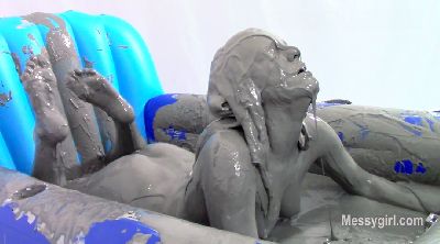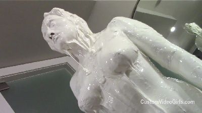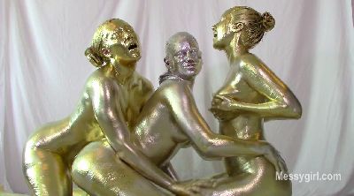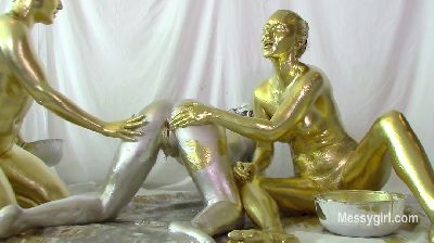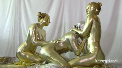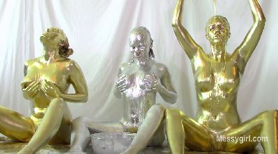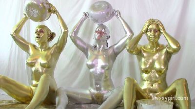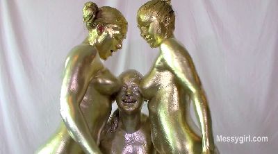 Amy, Misty and Penelope each have a large bowl of metallic paint. Amy and Penelope have gold and Misty has silver. The girls are nude as they begin to paint themselves. You will enjoy the interaction between them as they apply the paint. Once covered head to neck, they each pour the bowls of paint over their heads and give themselves paint facials. Now the girls are completly covered and get very playful with each other with slippery body rubbing.