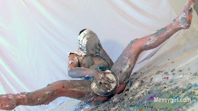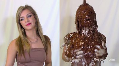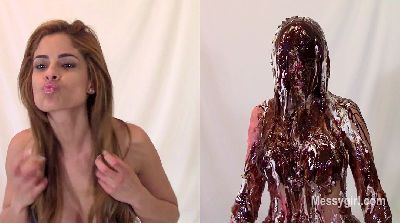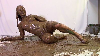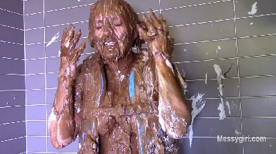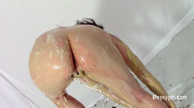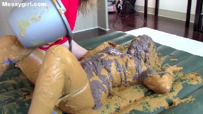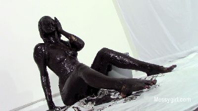 Penelope is in a sexy black vinyl dress and ankle boots. She gets on the floor and finds two catering size buckets of Nutella. She slowly starts to cover her dress and boots in the sweet stuff. You get a nice view of her ass and pussy as she does this. She then strips off the dress and continues the coverage on her nude body. She gets more into it and gives her face some very nice coverage. She is now unrecognizable. You get a nice view as she shows off every inch of her now Nutella slathered body. Very hot total coverage.