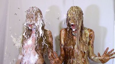 Nicole and Taylor are handing out flyers at a convention. They talk about how easy the gig is and how well it pays. Nicole takes a look at her flyer and realizes it has PIE ME printed on them. Then out of the blue she is pied hard in the face. Taylor finds out her flyer reads SLIME ME and sure enough, she has slime poured over her. The girls are shocked, but keep handing out the flyers. Then they have their dresses pulled off and are pied and slimed again. The girls are nude and covered in slop, but continue to hand out flyers.
