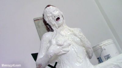 Amy is in a one piece lingerie top as she gets ready to cover herself in Nuru oil. She starts out slowly as she teases the viewers by talking very naughty and showing her tits and pussy. Before you know it she is nude and continues pouring the oil all over herself. She then starts to finger fuck her oiled pussy until she cums. Next she brings out a bucket of white creamy batter to dunk her head in. She pours it over her head and slops around in it on the floor. The mixture become a cum like substance and this turns on Amy. She finger fucks her sloppy pussy again until she cums.