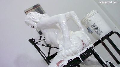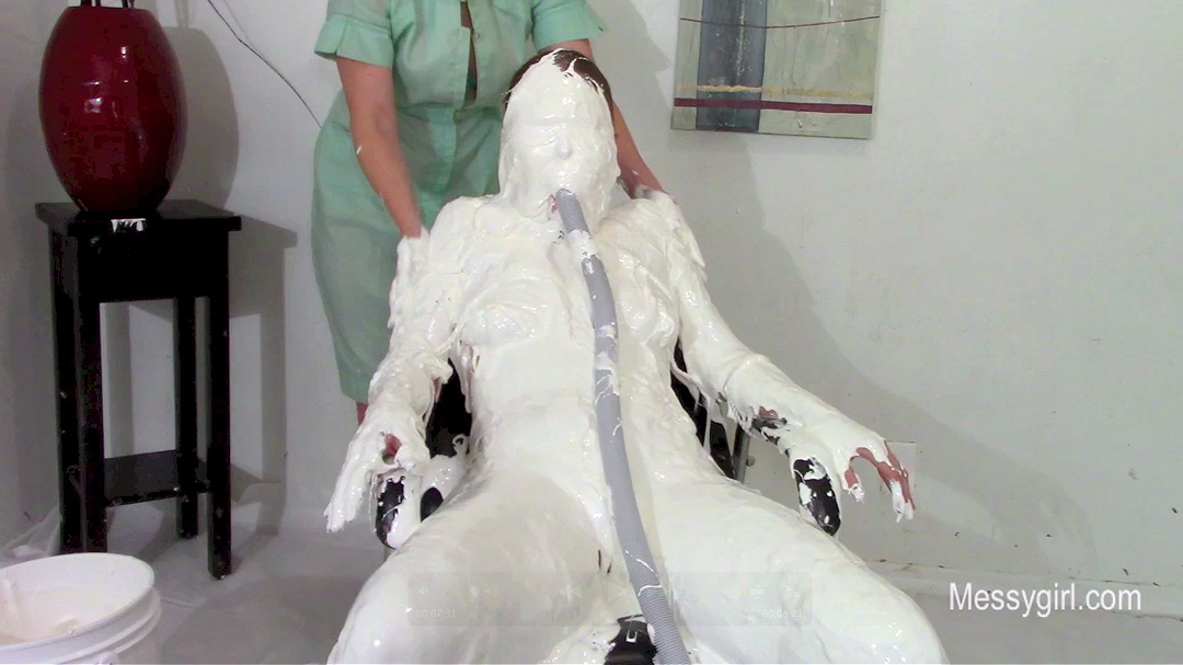 Amy is selling the Messy Boat 2000 and demonstrates all the features. As she talks about the features, she is pied and slimed non stop. During her messy onslaught, the slop starts to collect in the seating area around her. The receptacle at the end of the boat starts to fill up from the slop. Once filled, she proceeds to dunk her head in it. She then spread her legs and places her feet into the built in stirrups for more over the head pours. You get a nice view of her exposed pussy as the slop pours over her face and between her legs.