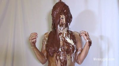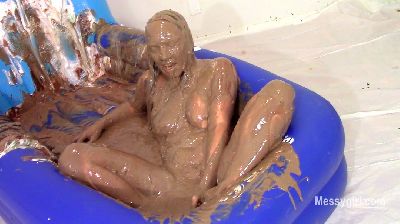 Amber wants to feel the creamy sensation of butter cream all over her body. So we give her a tub filled with pink, blue and purple butter cream. She starts out with her feet and slowly smears it up her body. She then globs it over her face and hair. She has turned into a gooey blue sky colored creature as she rubs it all over her body. Next comes a half gallon of chocolate syrup over her head. The contrast is amazing. She rubs it all over as well. She now has become a dark grey night color. The slippery mixture really turns her on. You get nice views of her sloppy pussy as the slippery mix drips from her plump pussy lips. Very sexy!
