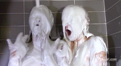 Nicole wants to show how her voice activated shower works while she is taking a shower with Taylor. She tells it to warm the water and it works like a charm. She then tells it to turn off and ice again it works fine. She then tells Taylor it has voice options for shampoo and cream rinse. When she commands cream rinse, it comes down on them in gallons. They both tell it to stop, but it keeps coming. The poor girls do all they can to stop it, but the deluge of cream keeps pouring on them. Both girls are transformed into sexy white cream blobs.