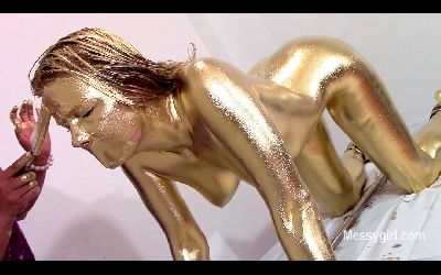 Vika is transfered into a human golden coffee table. Alana uses a special gold paint that freezes Vika and also gives her orgasms.