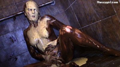 Vika covers herself in chocolate and vanilla batter in the shower. Once covered, she uses the shower spray nozzle to masturbate until she cums.