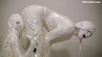 Amy and Penelope are tied back to back and covered in green methylcellulose slime. At fort that are grossed out, but soon the slippery sensation takes over and they become aroused and beg for more. They get their hands free to masturbate themselves and each other, as the slime pours over them. Because the slime is so thick, huge slime bubble emerge from their mouths and noses as they moan in pleasure.