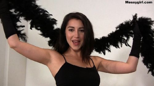 Penelope starts out nude and goes head first in the 5 gallon bucket of sticky fluff. She then starts to coat her sexy body and face until she is an unrecognizable blob. Once covered, she masturbates until she cums.