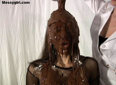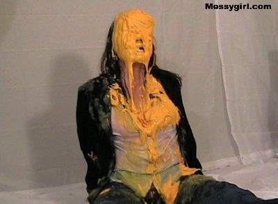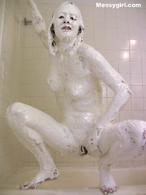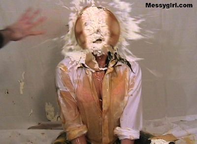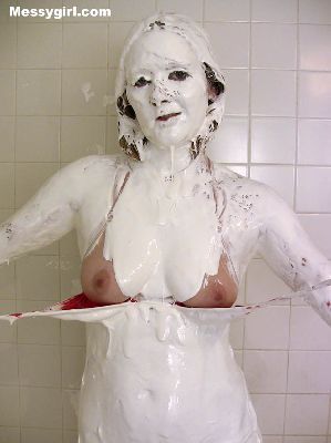 Vicky is in her white satin pajamas as she gets the messygirl treatment. Total coverage!
