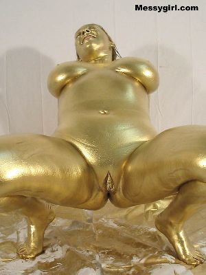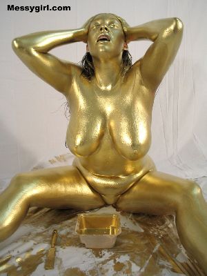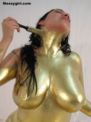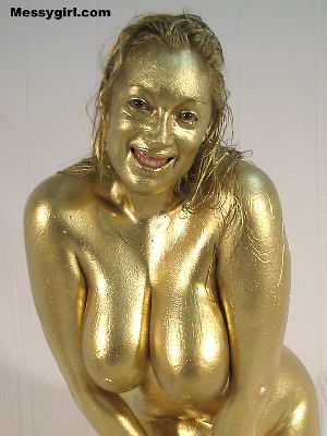 Busty Raven is covered head to toe in gold paint. All nude and sexy!