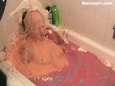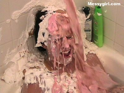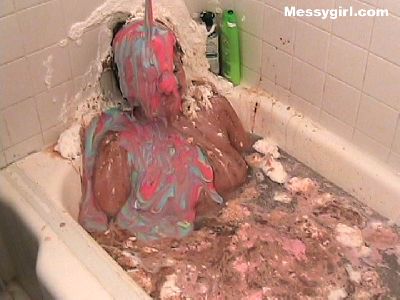Kobe's relaxing bath turns messy. She is pied, slimed with melted ice cream and chocolate syrup. She ends up masturbating and gets pied as she has her orgasm!